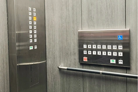 車いす利用者がスムーズに乗降できるように、十分な広さを確保しています。操作ボタンは車いすの高さに合わせて低い位置に設置し、押しやすいように配慮しています。